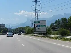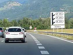 | Da51br | Sortie donnant également accès à une aire de service ou de repos, avec affectation de voie. | Blanc | Schéma simplifié de l'embranchement. La voie de sortie affectée est représentée par un trait séparé terminé en pointe de flèche et complété par le symbole d'échangeur SE2b ou SE2c et par une reproduction du signal E35a . | Distance de la sortie. | |