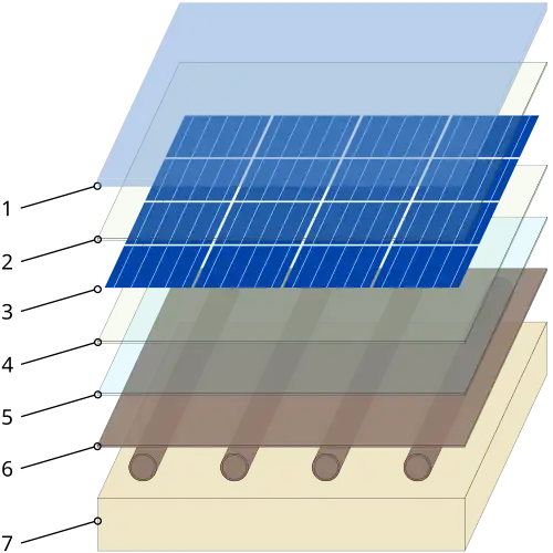 - Les cellules photovoltaïques fonctionnent mieux. En effet, leur couleur foncée fait qu'elles s'échauffent au soleil, or leur rendement de production électrique diminue avec la température, notamment au-dessus de 45 °C. Dans un panneau PV-T, le collecteur de chaleur capte la chaleur solaire, ce qui refroidit les cellules PV et augmente leur production notamment lors des pics d'insolation. La chaleur est injectée dans un accumulateur (circuit fermé eau/glycol en général) grâce au courant produit par les cellules photovoltaïques ; cela améliore significativement la production électrique (de 15 % environ en région parisienne selon les fabricants[1]) ;