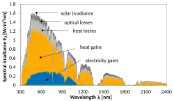 Le rendement énergétique global est nettement augmenté par rapport à celui des panneaux photovoltaïques (PV, 12-20 %), principalement en raison de la composante thermique (T), qui valorise également l'irradiation infrarouge non exploitée en photovoltaïque seul, laquelle représente 46 % du total).[réf. nécessaire]