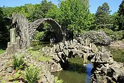 Le parc est un exemple de jardin à l'anglaise, et possède de nombreux petits étangs et lacs. Il est connu pour son Rakotzbrücke (également appelé Teufelsbrücke : Pont du Diable), construit au milieu du XIXe siècle. Le pont a été conçu pour former un cercle presque parfait avec son reflet dans la surface d'eau qu'il enjambe. Endroit prisé par les photographes, le pont est supporté par des colonnes basaltiques artificielles, extraites de carrières éloignées[2].