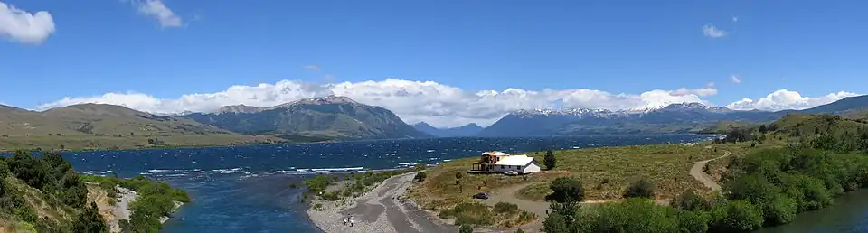 Le lac Huechulafquen au sein du parc national Lanín. À l'avant-plan : la « Boca del Chimehuin », point de départ du Río Chimehuin.