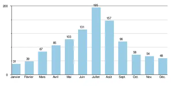 | Ensoleillement (h) | 347,2 | 277,2 | 251,1 | 186 | 136,4 | 111 | 117,8 | 155 | 192 | 251,1 | 309 | 334,8 | 2 668,6 |