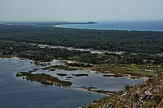 - la forêt de Strofyliá couvre environ 2 000 ha[5] entre, d'un côté, les dunes de la mer Ionienne et de l'autre, les lagunes et espaces agricoles. Parcourue du nord au sud par un canal, cette vaste étendue forestière est parsemée de mares et de petits étangs.