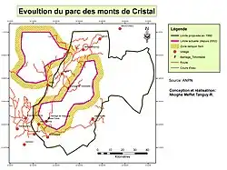 Dans cette optique, des études d'évaluation soutenues par la WCS, le WWF et le ministère des eaux et forêts débutèrent en 2001. Ces études s'appuyaient sur des prospectives biologiques et socio-économiques. Elles avaient pour but l'appréciation et l'évaluation non seulement du potentiel faunique et floristique, mais aussi l'impact des activités humaines à la périphérie de ce massif forestier[3].
