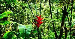 La forêt ombrophile est aussi qualifiée de forêt humide ou hygrophile, en effet il y tombe entre 3 000 et 6 000 mm d'eau par an. Les arbres sont très élevés, pouvant atteindre les 40 m de haut, les essences caractéristiques du milieu sont le Dacryodes excelsa (le gommier blanc), Chimarrhis cymosa (Bois de rivière), Sloanea truncata (connu localement comme le « châtaignier ») ou Talauma dodeca petala (Magnolia), accompagnés de cocotiers et de fougères arborescentes. Les épiphytes sont nombreuses[32].