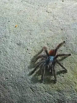 Le Matoutou falaise ou mygale aviculaire antillaise est une espèce endémique de mygales arboricoles. Les jeunes individus sont bleu foncé striés de noir sur l'abdomen. Les adultes se repèrent à leur abdomen rouge vif décoré d'une tâche rose, leurs pâtes sont roses violacé et ils atteignent une envergure de 15 cm[22]. Il est déconseillé de toucher ces mygales car leurs soies sont urticantes.