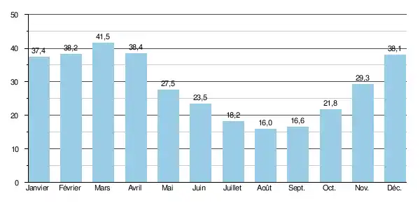 | Nombre de jours avec précipitations | 12,8 | 12,4 | 12,3 | 12,2 | 14,9 | 12,1 | 13,4 | 13,1 | 11,7 | 13,2 | 13,4 | 14,4 | 155,9 |