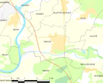 Parcey est limité au nord et à l'est par la route nationale 5, au sud par la Loue, à l'ouest par le Doubs.