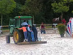 - ↑ Passer la barre : un tracteur tire une lourde barre sur le sable pour le damer. Ceci permet de donner au sable une consistance plus compacte et ainsi plus propice à la locomotion des chevaux