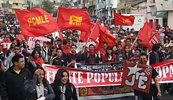 Clandestin, le PCMLE dispose d'un bras armé, le Groupe de combattants populaires (GCP)[2], mais aussi d'un bras électoral, le MPD, Mouvement populaire démocratique (en)[3], fondé en 1978. Dès les élections législatives de 1979, le MPD fait son entrée au Congrès national en la personne de Jaime Hurtado, premier député afro-équatorien[4],[3]. Très implanté dans le principal syndicat des enseignants équatoriens, l'UNE (Union nationale des éducateurs), le MPD dispose d'une base électorale qui lui permet d'obtenir, depuis sa fondation et jusqu'en 2007, un total de 29 députés, 21 maires et présidents de conseils municipaux. Le MPD soutient en 2007 le gouvernement de Rafael Correa[5], mais s'en désolidarise au fil des années et soutient en 2013 la candidature d'opposition de gauche d'Alberto Acosta (es) au sein d'une alliance avec, notamment, le Pachakutik, qui se révèle un échec (Alberto Acosta (es) se classe sixième sur huit candidats, avec moins de 3 % des suffrages)[6].