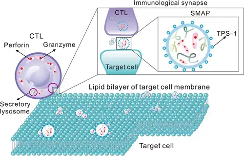La particule d'attaque supramoléculaire (supramolecular attack particle ou SMAP), découverte en 2020, est un mécanisme utilisé par les lymphocytes T CD8+ pour exercer leur action cytotoxique[1]. Le lymphocyte NK utilise aussi ce mécanisme pour exercer son action cytotoxique[2].