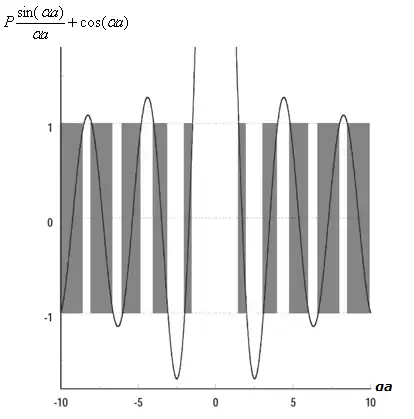 Solution graphique du problème du modèle de Kronig-Penney. est tracé en fonction de αa. Seules les zones grises pour lesquelles les valeurs de f sont comprises entre -1 et 1 représentent des valeurs de αa permises, donc des bandes d'énergie permises