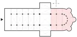 Pseudo-basilique : le vaisseau central a un étage de plus que les collatéraux, mais pas de fenêtres supérieures.