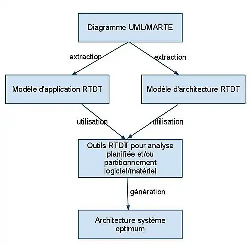 Pour passer des modèles UML vers un modèle de la plateforme d'exécution, il est nécessaire d'utiliser un outil. Dans le cadre de système en temps réels, un outil pouvant être utilisé est Real Time Design Trotter (associé à l'acronyme RTDT)[17]. Le processus de partitionnement avec cet outil est le suivant :