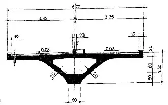 Le tablier est une poutre-caisson de forme triangulaire, de 6.70 m de largeur, de hauteur constante égale à 1.50 m (ce qui correspond à un élancement de 1/53). Au voisinage des pylônes, la section est épaissie, puis pleine sur toute la largeur de ceux-ci. La section transversale est constituée d’une dalle supérieure, et de deux âmes inclinées à 51 degrés sur la verticale et convergeant pour former un nœud inférieur. Le hourdis supérieur a une épaisseur variant de 0,178 m à 0,247 m. Son extrados comporte, dans le sens transversal, le même profil en toit incliné à 3 % que la chaussée.