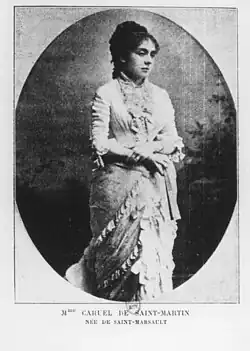 « La baronne de Caruël de Saint-Martin, née de Saint-Marsault, rouvrait hier les somptueux salons de son hôtel de l’avenue Hoche, qui étaient restés clos depuis la mort du baron, le regretté député au Corps législatif. La reine Nathalie de Serbie daignait honorer de sa présence cette réception, dont les honneurs lui étaient faits par la baronne de Saint-Martin, assistée de son gendre, le marquis de Partz. On a entendu un délicieux concert, où la princesse Bibesco et le comte de Gabriac se sont partagé les applaudissements de l’aristocratique assistance, parmi laquelle nous reconnaissons le comte et la comtesse de Damas, née de Juigné, le vicomte et la vicomtesse de Janzé, née de Choiseul, la comtesse de Rochechouart, née de la Rochejaquelein, le comte et mademoiselle de Riancey, le comte et la comtesse de Quélen, la marquise de Saint-Jean et la baronne de Baye, la comtesse de Lagrené, la comtesse de Pellan, MM. de Saint-Amand, d’Hébrard, des Coustures, de Saint-Priest, de Job, de Villereau, de Munkacsy, de Forceville, etc. etc. »[9]