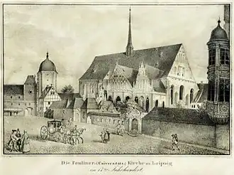 Le bâtiment, consacré en 1240, était l'église abbatiale d'un couvent dominicain. Après sa dissolution en 1543, tous les bâtiments du monastère sont attribués à l'université de Leipzig au cours de la sécularisation.