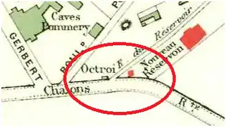 Le pavillon de l'Octroi de la porte de Vesle (Porte de Paris) se trouve sur la droite de la photo. Les grilles de la porte de Paris ont été déplacées mais les piliers, encore visibles sur place, matérialisant l'emplacement du pavillon de Vesle au passage de l'Avenue de paris à la Rue du Colonel Fabien.