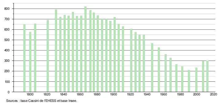 L'évolution du nombre d'habitants est connue à travers les recensements de la population effectués dans la commune depuis 1793. À partir du , les populations légales des communes sont publiées annuellement dans le cadre d'un recensement qui repose désormais sur une collecte d'information annuelle, concernant successivement tous les territoires communaux au cours d'une période de cinq ans. Pour les communes de moins de 10 000 habitants, une enquête de recensement portant sur toute la population est réalisée tous les cinq ans, les populations légales des années intermédiaires étant quant à elles estimées par interpolation ou extrapolation[3]. Pour la commune, le premier recensement exhaustif entrant dans le cadre du nouveau dispositif a été réalisé en 2007[4],[Note 1].