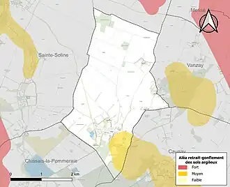 Les mouvements de terrains susceptibles de se produire sur la commune sont des tassements différentiels[15]. Le retrait-gonflement des sols argileux est susceptible d'engendrer des dommages importants aux bâtiments en cas d’alternance de périodes de sécheresse et de pluie[16]. 6,4 % de la superficie communale est en aléa moyen ou fort (54,9 % au niveau départemental et 48,5 % au niveau national)[Carte 2]. Depuis le , en application de la loi ELAN, différentes contraintes s'imposent aux vendeurs, maîtres d'ouvrages ou constructeurs de biens situés dans une zone classée en aléa moyen ou fort[Note 1],[17].