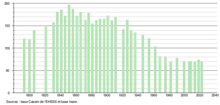 L'évolution du nombre d'habitants est connue à travers les recensements de la population effectués dans la commune depuis 1793. Pour les communes de moins de 10 000 habitants, une enquête de recensement portant sur toute la population est réalisée tous les cinq ans, les populations de référence des années intermédiaires étant quant à elles estimées par interpolation ou extrapolation[20]. Pour la commune, le premier recensement exhaustif entrant dans le cadre du nouveau dispositif a été réalisé en 2008[21].