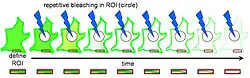 Avant que le photoblanchiment puisse avoir lieu, on doit injecter une protéine fluorescente dans les cellules (on utilise généralement une GFP), ce qui va permettre aux protéines ciblées d'émettre de la fluorescence et ainsi de pouvoir les suivre au cours du processus. Ensuite, on doit définir une région d'intérêt ; cette région d'intérêt initiale contient généralement la cellule en entier ou bien plusieurs cellules. En FLIP, le photoblanchiment a lieu juste en dehors de cette région d'intérêt, c'est pourquoi une région de photoblanchiment doit également être définie. On doit enfin déterminer une troisième région, celle où la mesure se fera. Un certain nombre de balayages initiaux doit être fait afin de d'identifier la fluorescence avant le photoblanchiment. Ces balayages serviront de contrôles auxquels on comparera les balayages photoblanchis. À la suite de cela, le photoblanchiment peut enfin avoir lieu. Entre chaque "pulse" de blanchiment, il est nécessaire de laisser du temps au matériel fluorescent pour revenir à son état initial. Il est également important de prendre plusieurs balayages de la région d'intérêt immédiatement après chaque pulse de blanchiment pour étude complémentaire approfondie[1]. Le changement du niveau de fluorescence dans la région d'intérêt peut ensuite être quantifié de trois façons différentes. La plus commune est de choisir l'emplacement, la taille et le nombre de régions d'intérêt en se basant sur une inspection visuelle des groupes d'images à disposition. Les deux autres, plus récentes mais plus fiables, consistent soit à détecter des zones de mobilité de sonde différente sur base d'image individuelle, soit à modéliser physiquement la perte de fluorescence des corps en mouvement[2].