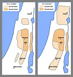 Israël Finkelstein a été le premier à effectuer des regional surveys[9], c’est-à-dire à pratiquer une méthode statistique qui a permis cette découverte : toute une équipe a effectué un ramassage de tous les débris de matériaux liés à la présence humaine, lors d’un ratissage systématique de toute la région des hautes terres, à partir de 1990. Chaque débris, daté, a fourni un point sur la carte correspondant à cette date. L’ensemble de toutes ces cartes a, par l’accumulation des résultats, permis de localiser petit à petit les premières présences humaines sur les Hautes Terres. Des fouilles locales ont, finalement, permis de mettre au jour les murs des enclos, les restes des habitations et des citernes creusées dans le roc, sur le site de Silo[35]. Vers -1000, la population sédentarisée est estimée à 40 000 habitants répartis sur 230 sites dans la moitié nord, pour 5 000 habitants répartis sur vingt sites dans la moitié sud. L’étude fine de la croissance de cette population au cours du temps montre que la sédentarisation est progressive et très régulière sur toute la durée du Fer I au Fer IIA.