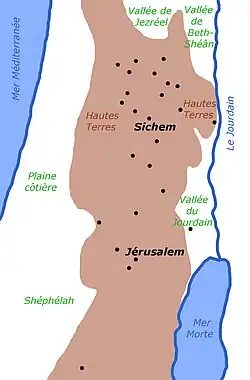 Sichem, la plus grande cité de la partie nord des collines centrales depuis le Bronze moyen au Fer I, est abondamment mentionnée dans des sources historiques (notamment Lettres d'Amarna). Elle est détruite au Bronze récent mais immédiatement reconstruite et réoccupée. Elle est alors moins peuplée, mais les implantations du Fer I s’y observent sans destruction ni révolution dans la culture archéologique. Les fouilles ayant été menées avec les techniques de l’époque (sans datation au carbone 14) et le rapport final n’ayant pas été publié, aucune culture matérielle précise de l’époque du Fer I n’est clairement mise au jour.