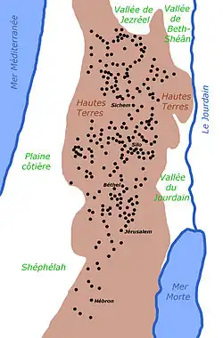 La plupart des premières zones d'occupation datant des débuts du Fer I sont situées à l'est (côté Jourdain), ce qui permet aux habitants de faire paître leurs troupeaux de chèvres et de moutons tout en démarrant une activité agricole de blé et d'orge. Les implantations s'étendent ensuite à l'ouest, moins propice à l'élevage, mais plus propice à la culture de l'olivier et de la vigne[13],[14]. Dès le début, le développement est beaucoup plus rapide dans la moitié nord, plus arrosée et traversée par les voies de communication, que dans la moitié sud, sèche et peu accessible. Commencée sous forme de petites communautés rurales, cette dernière vague se développe graduellement en un système de petits villages, de bourgades de dimensions moyennes, pour atteindre les vallées et former de grandes cités.