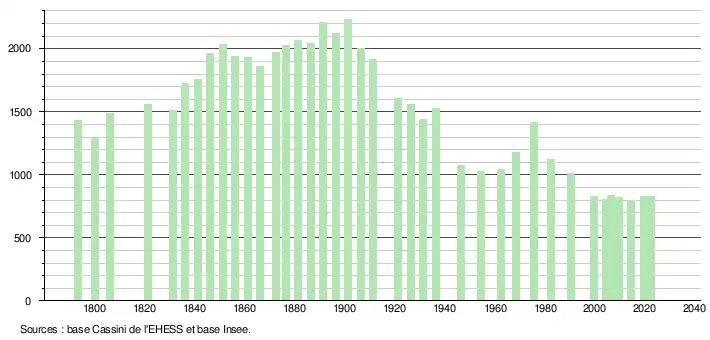 | L'évolution du nombre d'habitants est connue à travers les recensements de la population effectués dans la commune depuis 1793. Pour les communes de moins de 10 000 habitants, une enquête de recensement portant sur toute la population est réalisée tous les cinq ans, les populations de référence des années intermédiaires étant quant à elles estimées par interpolation ou extrapolation[25]. Pour la commune, le premier recensement exhaustif entrant dans le cadre du nouveau dispositif a été réalisé en 2004[26]. En 2022, la commune comptait 831 habitants[Note 2], en évolution de −3,37 % par rapport à 2016 (Corrèze : −0,59 %, France hors Mayotte : +2,11 %). |