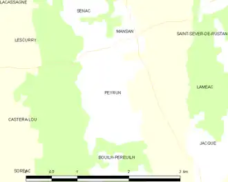 Les communes les plus proches[Note 1] sont[3] : Mansan (1,0 km), Jacque (2,4 km), Bouilh-Péreuilh (2,7 km), Sénac (2,9 km), Lescurry (2,9 km), Laméac (3,0 km), Soréac (3,2 km), Marseillan (3,6 km).