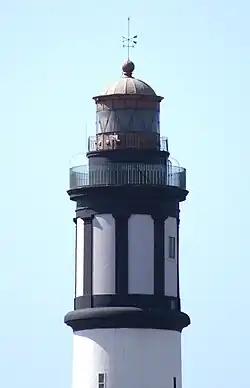 - De Ø 3 m à murette et ventilateurs (elle est posée sur la murette maçonnée). Lanterne à boule et piédouche. Vitrage cylindrique simple à montants inclinés. La lanterne est éclairée par une lampe halo de 1 000 W, ce qui donnerait au phare une portée d'environ 28 milles, bien qu'une source semble indiquer une portée de 40 milles[8],[12].