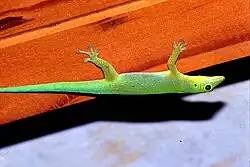 C'est un gecko diurne et arboricole qui mesure jusqu'à 60 mm. Il est de couleur vert citron, avec des points et bandes orangées.