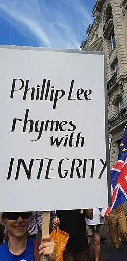 - ↑ (en) Lee, « After a great deal of thought, I have reached the conclusion that it is no longer possible to serve my constituents' and country's best interests as a Conservative Member of Parliament. My letter to the Prime Minister » [archive du ], Twitter.com @DrPhillipLeeMP, (consulté le ) : « pic.twitter.com/0QreSbSdwR »