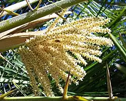 Les plantes sont unisexuées et des inflorescences apparaissent au sommet de la tige du palmier. Les fleurons mâles sont d'un jaune pâle sale et tombent après la floraison; les femelles sont petites, globuleuses et jaune-vert.