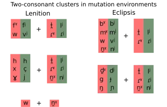 En contexte de mutation consonantique initiale, il existe une gamme beaucoup plus large de groupes consonantiques possibles en début de mot[53] ; par exemple, en contexte de lénition, on retrouve les mots suivants : bhlas /wl̪ˠasˠ/ « goûta », bhris /vʲɾʲɪʃ/ « cassa », chleacht /çlʲaxt̪ˠ/ « exerça », chrom /xɾˠɔmˠ/ « courba », ghreamaigh /ˈjɾʲamˠə/ « colla », ghníomhaigh /ˈjnʲiːwə/ « agit », shleamhnaigh /hlʲəun̪ˠə/ « glissa », shnámh /hn̪ˠaːw/ « nagea », shroich /hɾˠɪç/ « atteignit ». En contexte d'éclipse, on retrouve : mbláth /mˠl̪ˠaː/ « fleur », mbliana /ˈmʲlʲiən̪ˠə/ « ans », mbrisfeá /ˈmʲɾʲɪʃaː/ « tu casserais », ndlúth /n̪ˠl̪ˠuː/ « déformer », ndroichead /ˈn̪ˠɾˠɔhəd̪ˠ/ « pont », ndréimire /ˈnʲɾʲeːmʲəɾʲə/ « échelle », ngléasfá /ˈɲlʲeːsˠaː/ « tu habillerais », ngreadfá /ˈɲɾʲat̪ˠaː/ « tu partirais », ngníomhófá /ˈɲnʲiːwoːhaː/ « tu agirais ».