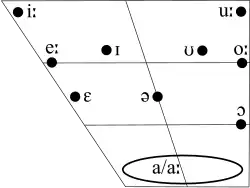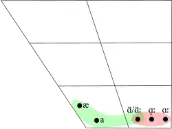 Dans les variétés du Connacht[40] les allophones de /a/ bref sont systématiquement plus avancés que les allophones de /aː/ long. À Erris, par exemple, /a/ bref varie d'une voyelle pré-ouverte antérieure [æ] devant consonne étroite (par exemple sail [sˠælʲ] « cérumen ») à un [a] ouvert après consonne étroite (par exemple geal [ɟalˠ] « brillant ») à un [ɑ̈] postérieur centralisé entre consonnes étendues (par exemple capall [ˈkɑ̈pəl̪ˠ] « cheval »). Le phonème /aː/ long, en revanche, varie d'un [ɑː] postérieur entre consonnes étendues (par exemple bád [bˠɑːd̪ˠ] « bateau ») à un [ɑ̟ː] postérieur avancé devant consonne étroite (par exemple fáil [fˠɑ̟ːlʲ] « obtenir ») à un [ɑ̈ː] postérieur centralisé après consonne étroite (par exemple breá [bʲɾʲɑ̈ː] « excellent »). À Tourmakeady[41], l'allophone postérieur est arrondi en [ɒː] après les labiales étendues (par exemple bán [bˠɒːn̪ˠ] « blanc »). Dans le Connemara, les allophones de /a/ sont allongés, de sorte que seule la qualité vocalique différencie les allophones de /a/ de ceux de /aː/[42].