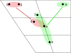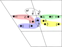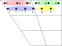 Le point de départ de /iə/ varie d'un [i] fermé antérieur après consonne étroite à un [i̠] rétracté après /ɾˠ/ en début de mot (seul contexte dans lequel il apparaît après une consonne étendue). Son point d'arrivée varie d'un [ə] mi-central devant consonne étendue à un [ë] mi-fermé antérieur centralisé devant consonne étroite[46] (par exemple, ciall [ciəl̪ˠ] « sens », riamh [ɾˠi̠əvˠ] « jamais », diabhail [dʲiëlʲ] « diables »).