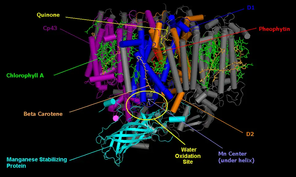 Sa structure a été résolue en 2011 avec une résolution de 1,9 Å, ce qui a révélé la présence de cinq atomes d'oxygène servant de ponts oxo entre les cinq atomes métalliques et quatre molécules d'eau liées au cluster Mn4CaO5. Plus de 1 300 molécules d'eau ont été trouvées dans chaque photosystème II, certaines formant de grands réseaux par liaison hydrogène qui pourraient servir de canaux à protons H+, à molécules d'eau H2O ou à oxygène O2[5].