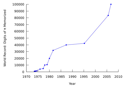 - ↑ Par ex. (en) MSNBC, Man recites pi from memory to 83,431 places, 3 juillet 2005 ; (en) Matt Schudel, « Obituaries: Mathematician John W. Wrench Jr. Dies at 97 », The Washington Post, (lire en ligne) ; (en) Steve Connor, « The Big Question: How close have we come to knowing the precise value of pi? », The Independent, (lire en ligne) ; (en) Chris Smyth, « Pi, a mathematical story that would take 49,000 years to tell », The Times, (lire en ligne).