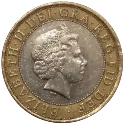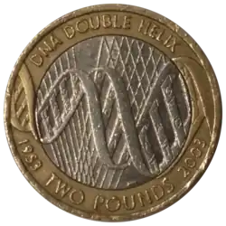 En 1998, le même système est introduit pour lancer la pièce de 2 livres conçu par Ian Rank-Broadley (avers) et Bruce Rushin (revers), frappée régulièrement jusqu'en 2015.