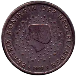 L'effigie stylisée de Beatrix (1938- ), Reine des Pays-Bas, tournée vers la gauche et entourée de points et des douze étoiles du drapeau européen. Le pourtour reprend la légende BEATRIX KONINGIN DER NEDERLANDEN (Beatrix Reine des Pays-Bas), complétée en bas par le millésime. | |
