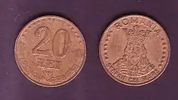 24 mm | 5,00 g | acier plaqué laiton | le buste d'Étienne III le Grand, son nom Stefan Cel Mare et la mention ROMANIA | la valeur faciale 20 LEI et la mention ROMANIA sur des branches de chêne. | 1991-2004 | |