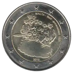 Foule d'hommes, de femmes et d'enfants et carte des îles maltaises. En haut à droite, le nom du pays émetteur MALTA, suivi de la légende Self-government 1921. En bas, le millésime 2013. L'anneau externe de la pièce comporte les douze étoiles du drapeau européen.