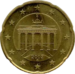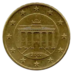 - Pièces de 10, 20 et 50 centimes : La Porte de Brandebourg, à Berlin, choisie comme symbole de la réunification allemande et européenne[2], au-dessus du millésime. Le tout est entouré des 12 étoiles du drapeau européen dans un anneau. La gravure est de Reinhard Heinsdorff[1].