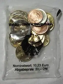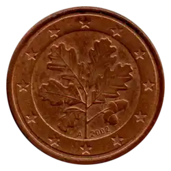 - Pièces de 1, 2 et 5 centimes : Un rameau de chêne composé de 5 feuilles et de 2 glands, à la base duquel est indiqué le millésime. Le tout est entouré des 12 étoiles du drapeau européen en creux dans un anneau. La gravure est de Rolf Lederbogen[1]. Les feuilles de chêne, symbole de robustesse, étaient déjà présentes sur les pièces en pfennig[2].