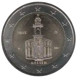 La représentation de l'église Saint-Paul de Francfort-sur-le-Main. En haut, à gauche, le millésime 2015. En bas, la légende HESSEN (Hesse). En haut à droite, l'initiale du pays émetteur D (pour Deutschland). L'anneau externe de la pièce comporte les douze étoiles du drapeau européen. | ||||||