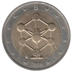 La représentation de l'Atomium, à Bruxelles. La lettre B, initiale de la Belgique apparaît en haut de la pièce et le millésime 2006 apparaît en bas. L'anneau externe de la pièce comporte les douze étoiles du drapeau européen.