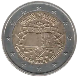 Le centre de la pièce représente le traité signé par les six États membres fondateurs devant un arrière-plan évoquant le dallage, dessiné par Michel-Ange, de la place du Capitole, à Rome, où le traité a été signé le 25 mars 1957. La traduction du mot EUROP complété par un petit A et un petit E figure au-dessus du livre. La légende latine PACTVM ROMANVM QVINQVAGENARIVM est inscrite au-dessus du dessin. L'année 2007 et le nom du pays émetteur en français, néerlandais et allemand BELGIQUE–BELGIE–BELGIEN sont inscrits sous le dessin. L'anneau externe de la pièce comporte les douze étoiles du drapeau européen.