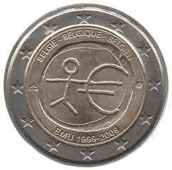 Tous les pays de la zone euro ont émis le 1er janvier une pièce commémorative de 2 € pour célébrer le 10eanniversaire de l'Union économique et monétaire. Le centre de la pièce illustre une silhouette humaine stylisée dont le bras gauche est prolongé par le symbole de l'euro. Le nom du pays émetteur en néerlandais, français et allemand BELGIE–BELGIQUE–BELGIEN apparaît dans la partie supérieure, tandis que l'indication 1999-2009 et l'acronyme EMU (pour Economic and Monetary Union, Union économique et monétaire ou UEM) apparaissent dans la partie inférieure. L'anneau externe de la pièce représente les douze étoiles du drapeau européen.